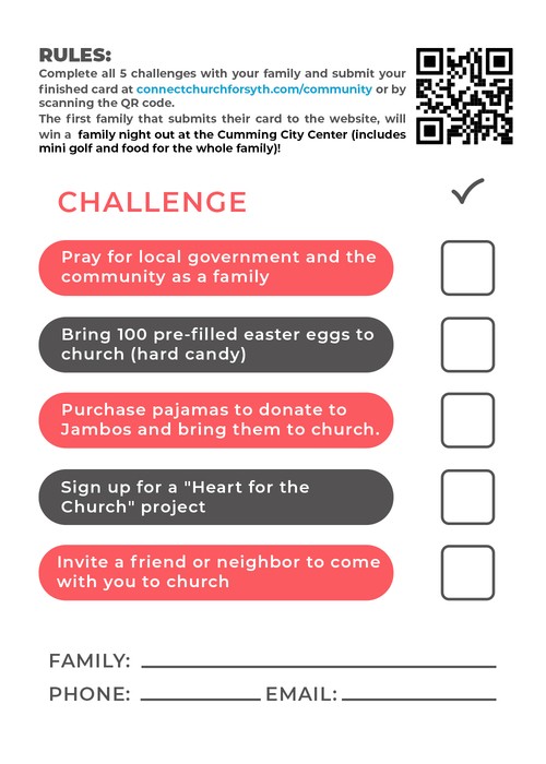 Congrats on completing all 5 challenges with your family! This is the place to submit your finished card and enter for a chance to win a Family Night Out at Cumming City Center—including mini golf and food for the whole family!